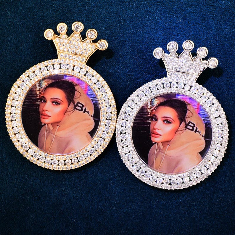Personalized Crown Round Photo Frame Pendant Necklace, Custom Hip Hop Iced Out Copper Zircon Picture Chain, DIY Fashion Jewelry