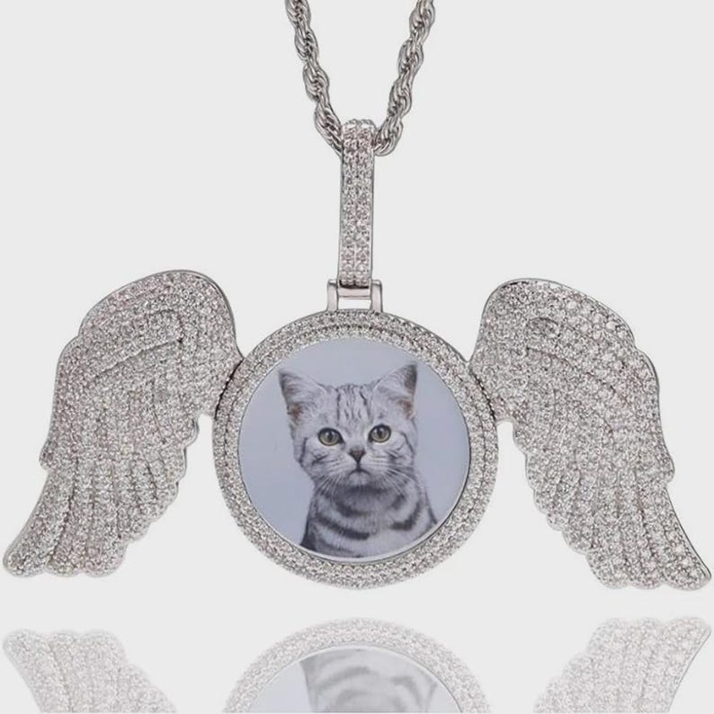 Personalized Small Wings Flip Round Photo Pendant Necklace, Custom Hip Hop Iced Out Copper Zircon DIY Picture Jewelry for Men Women