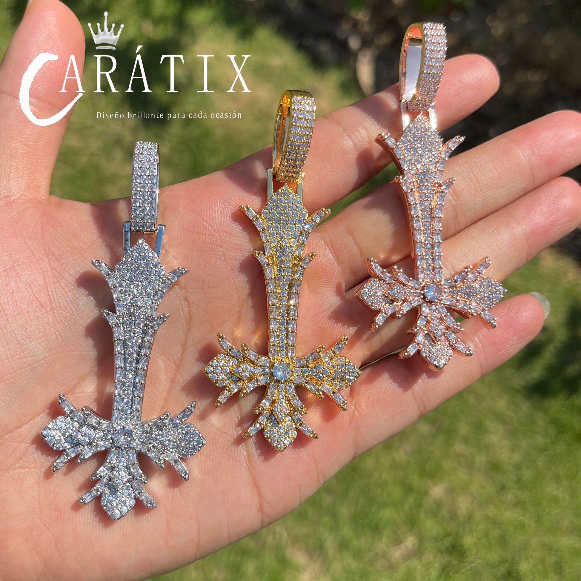 CARÁTIX necklaces aren’t just accessories—they’re bold statements of individuality, style, and confidence. Shine bright with this iced-out bubble letter inverted cross pendant necklace.