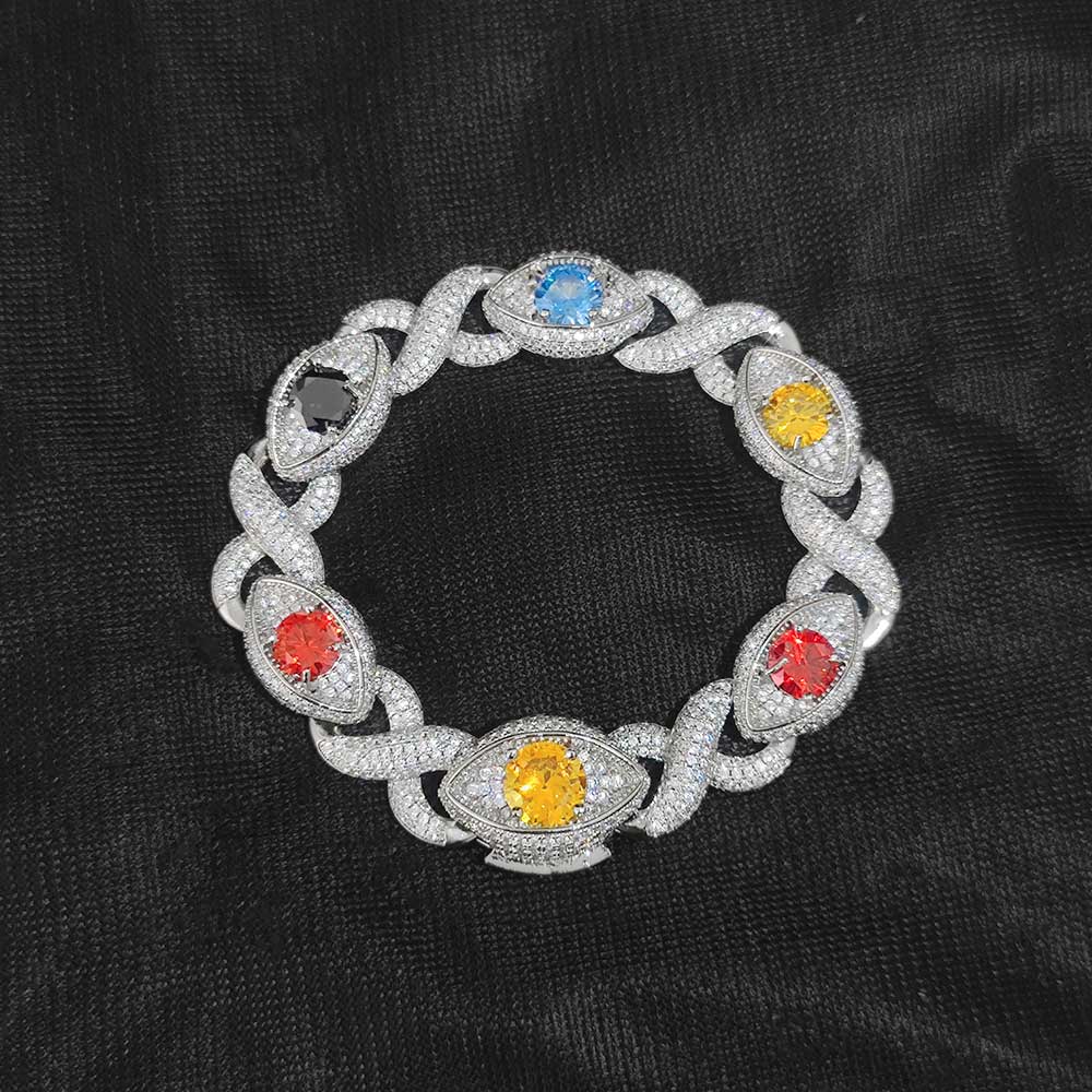 Each piece features a signature Evil Eye charm surrounded by color zircon stones, symbolizing protection, awareness, and good fortune. The Cuban link chain is fully iced out with 5A+ CZ stones, offering unmatched shine that glows under every light.