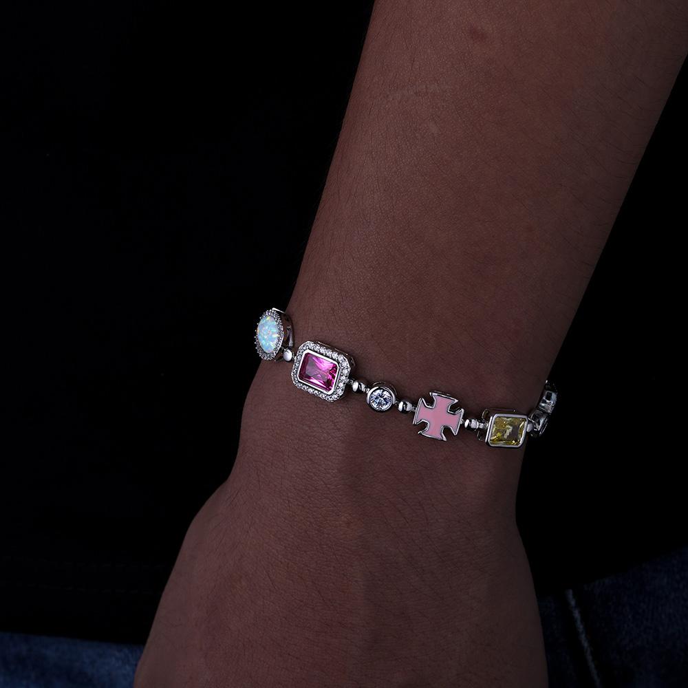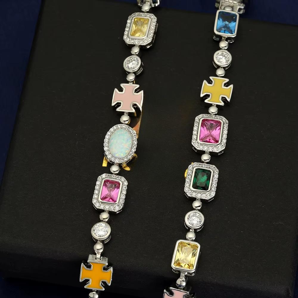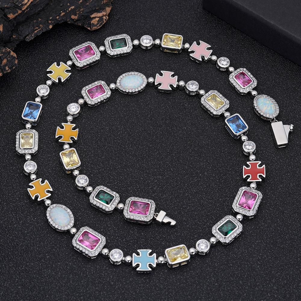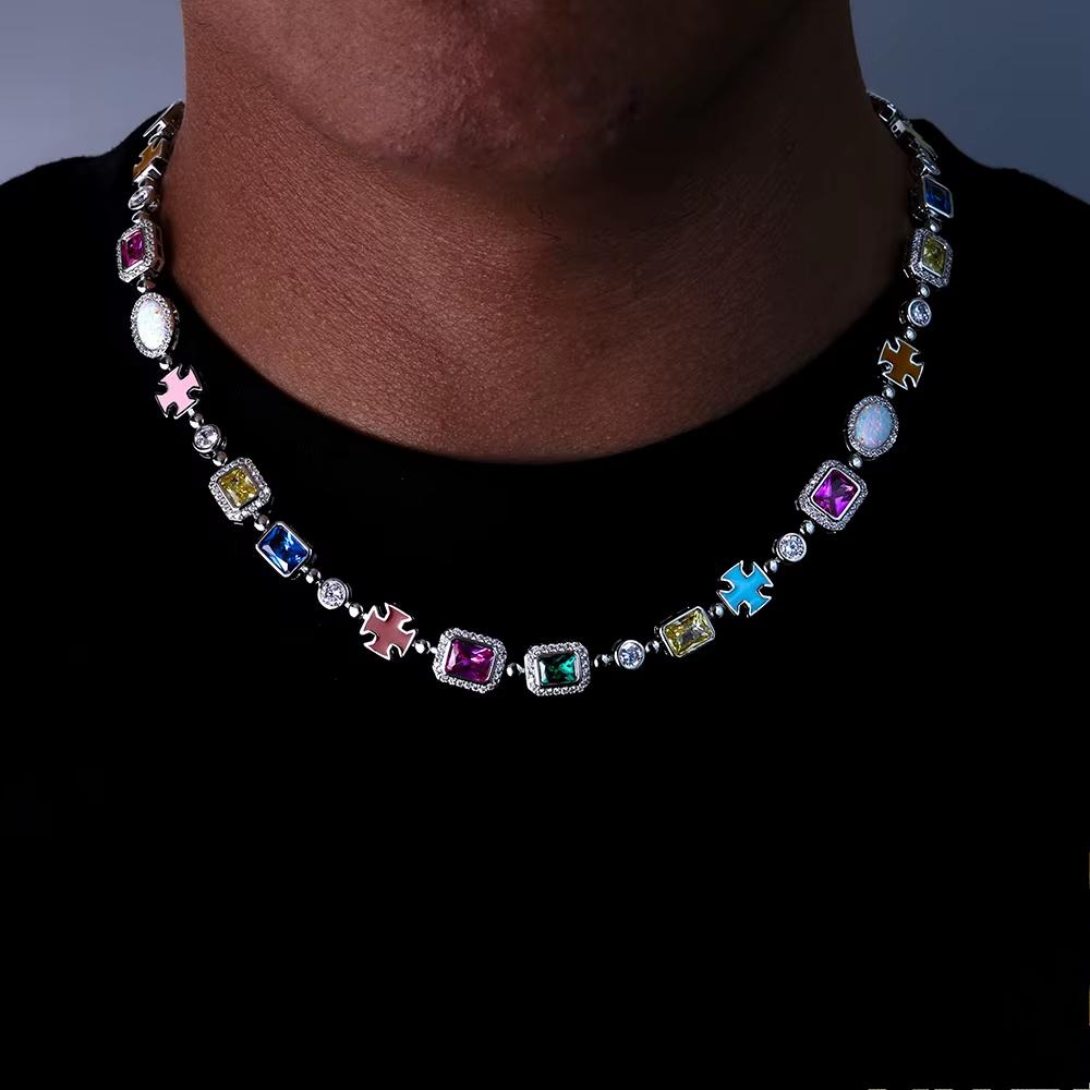 CARÁTIX - 10mm Custom Multi Color Enamel Bling Cz Stone Chain Silver Geometric Gemstone Motif Chain Necklace Valentine's Day Gift for Men & Girls & Boys Mothers' Day Gift #Springtok