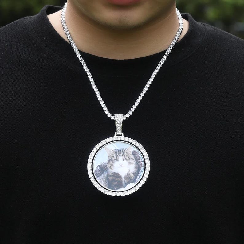 Express your style and keep your memories close with a large rotating double-sided photo pendant. Bold, personalized, and iced out — it’s a standout piece for men who love hip-hop fashion and meaningful jewelry.